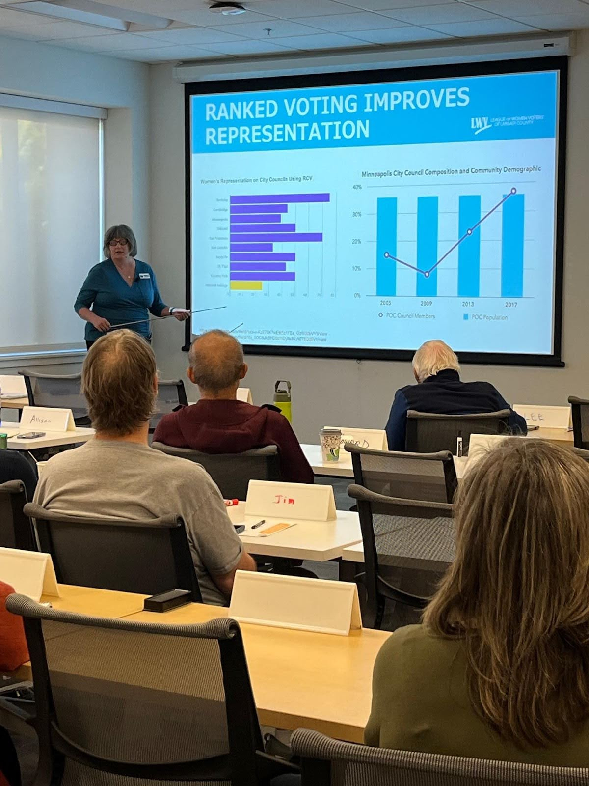 In collaboration with both the Fort Collins and Larimer County clerks’ offices, the Election Reform and Voter Services teams stepped up big time this fall to educate Fort Collins voters about the inaugural use of ranked voting in the city’s November municipal elections. Thanks in part to the League’s advocacy efforts in 2021, ranked voting was referred to the Fort Collins ballot and passed by Fort Collins voters in 2022 with over 58% of the vote. The education effort was a multi-pronged approach involving nearly 100 volunteers, 80% of whom were LWVLC members:
