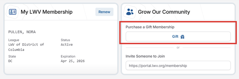 To purchase a gift membership, log in to the portal at portal.lwv.org. You will see a “Grow Our Community” box, which includes a button to purchase a gift membership (see below). Click “Gift,” and you’ll be taken to a form where you can enter the member’s information, choose their League, and select the dues amount you’ll pay for them. Note that the membership can be purchased in another League for those not living near us!